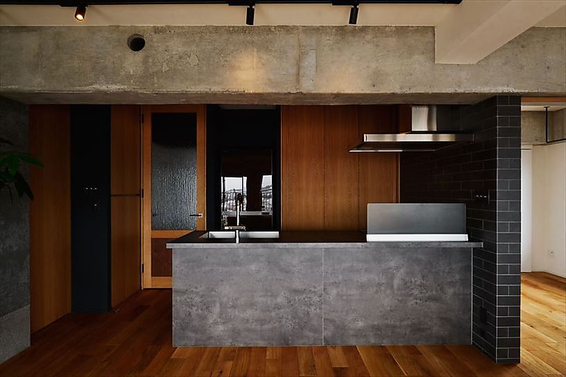 U邸で印象的なのは眺望もそうですが、随所に見られる「絵になる素材づかい」。壁に採用したセメント系内装ボード「SOLID typeF coffee」は、使用済みのコーヒー豆が配合されたエコ建材。