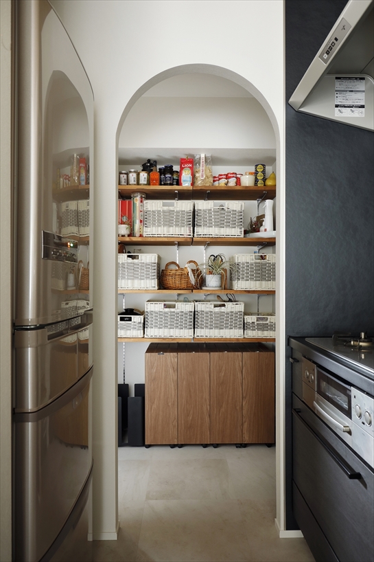 一番の悩みどころはキッチン周りのレイアウト。直床のお住まいだったため、配管の関係で窓向きの対面キッチンが難しく、窓に対して横向きのレイアウトに。キッチンのあった場所には玄関からつながるシューズインクローゼットとパントリーを配置。家事がスムーズになる回遊動線を作ることができました。