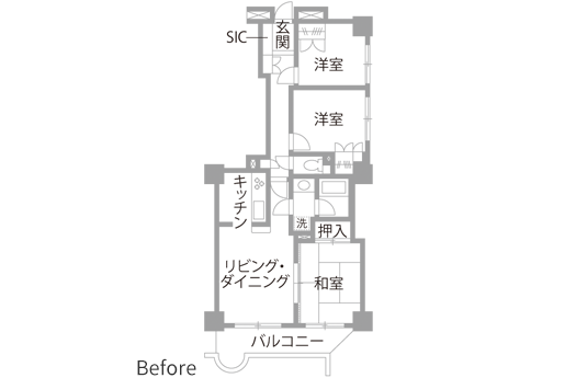 築25年のマンションにお住まいのWさんご夫妻は、水回りや内装の老朽化をきっかけにリフォームを検討されていらっしゃいました。一番心配だったのは老朽化した給排水管からの漏水。下の階の方にご迷惑をかける前に改修したいとのご希望でした。キッチンの狭さや収納不足を解消し、この機会にお客様をお招きしてお食事を楽しめる心地よいLDKや妻のM様が趣味で楽しまれているアロマテラピーサロンのスペースもつくることができれば、とご相談いただきました。